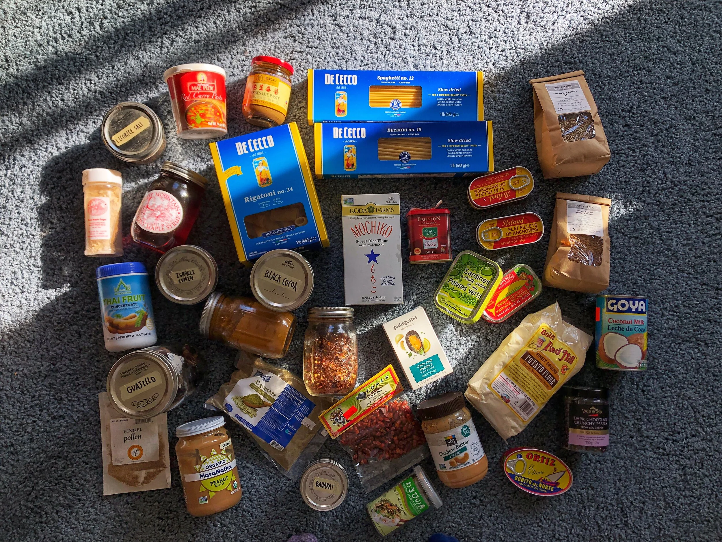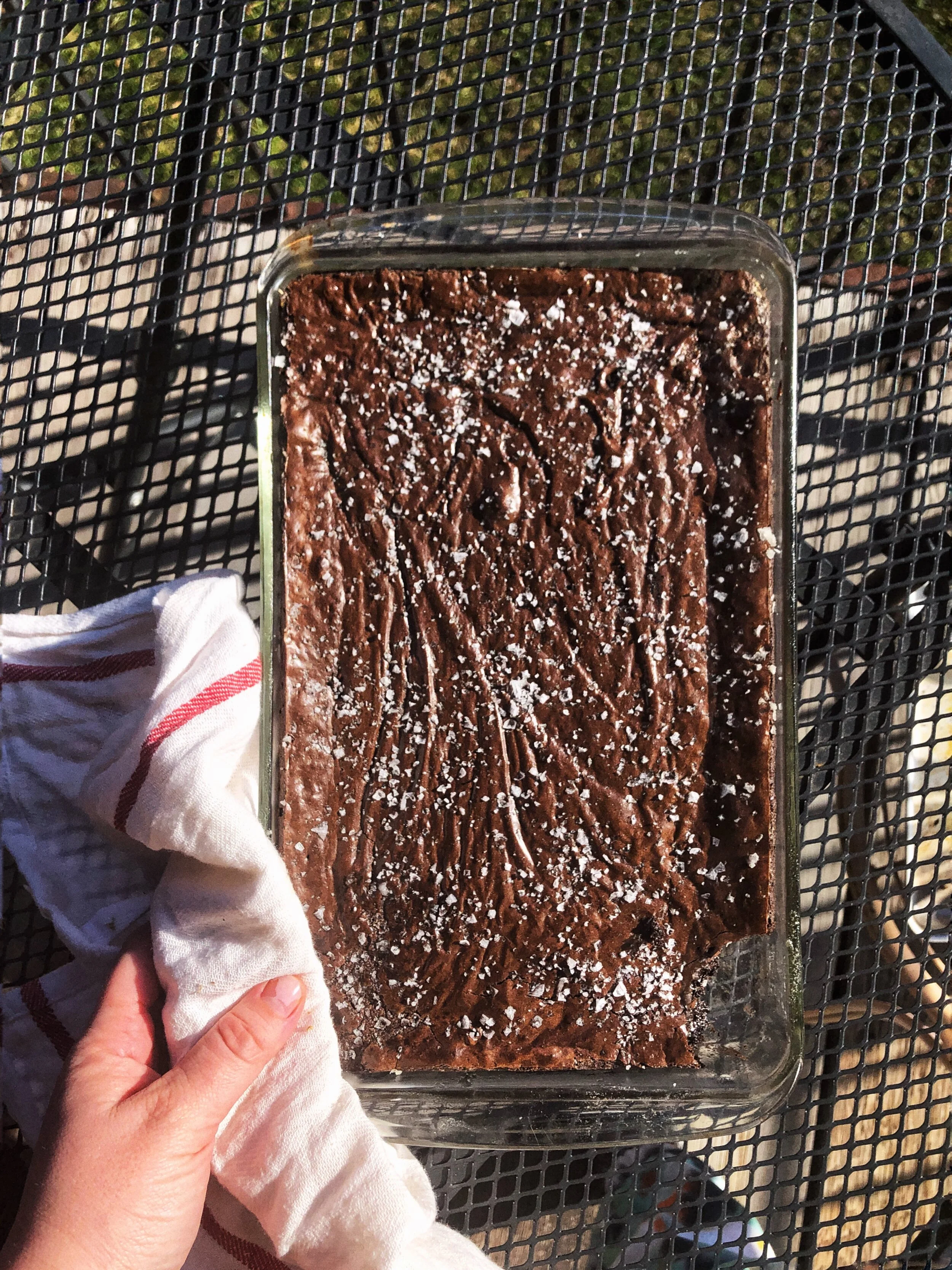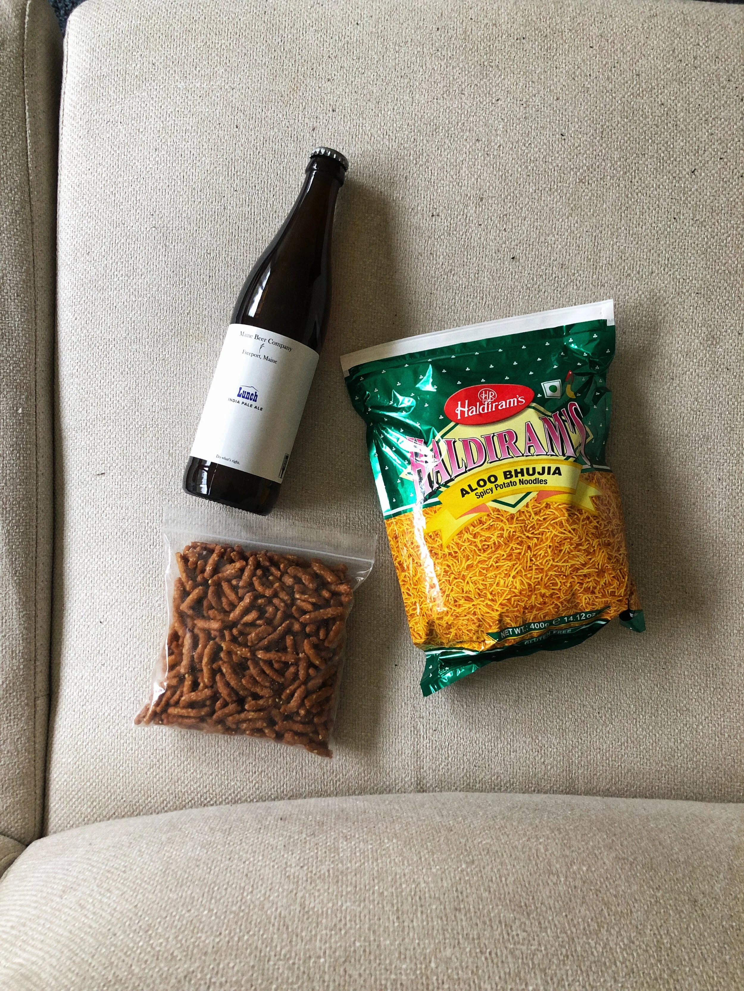 gooey rye flour brownies with flaky salt ; wheat berry salad with pink chicories and kale ; some snacky favorites (honey sesame sticks, beer from Maine, crispy little Indian chickpea and potato flour crunchies)