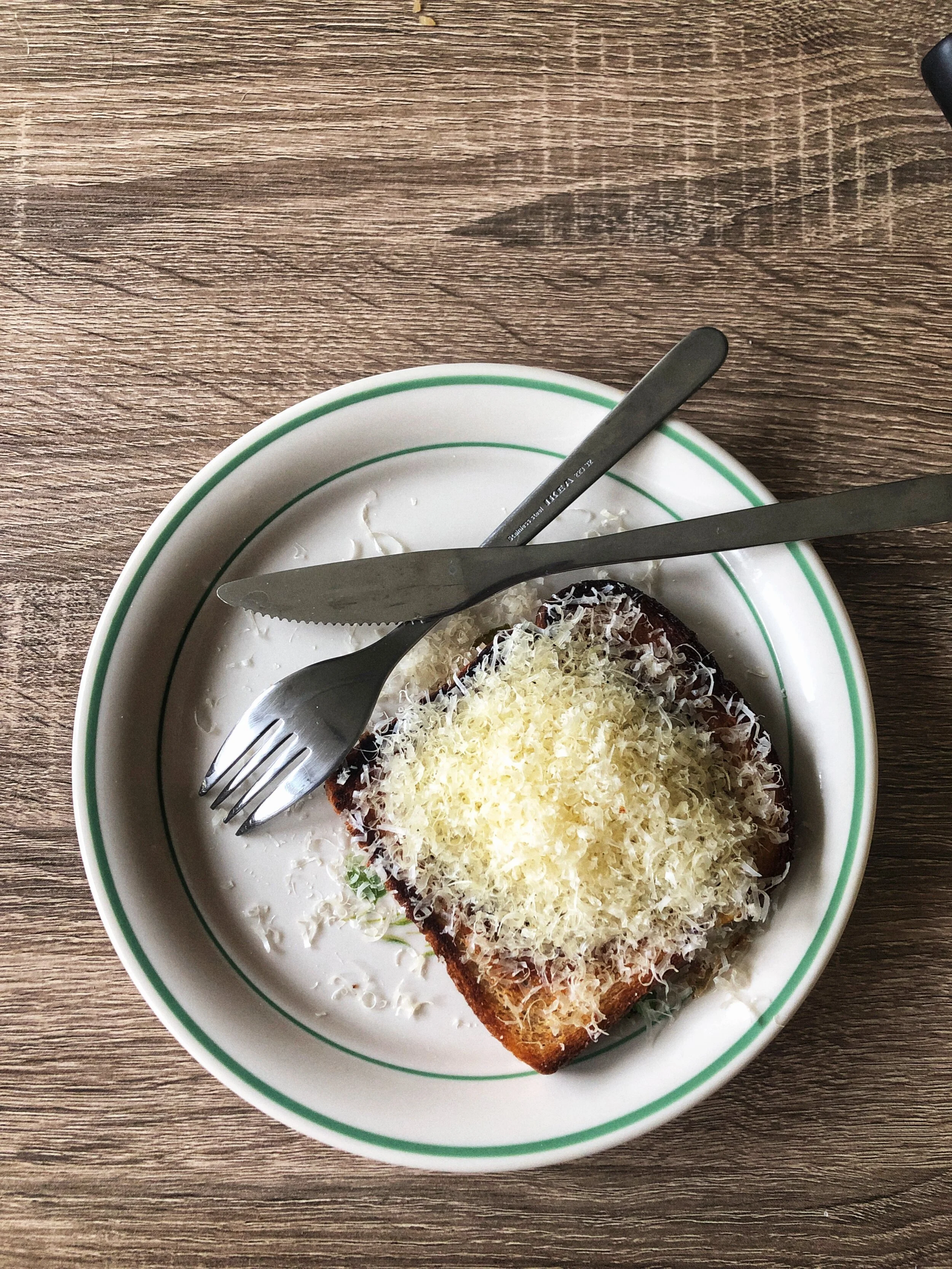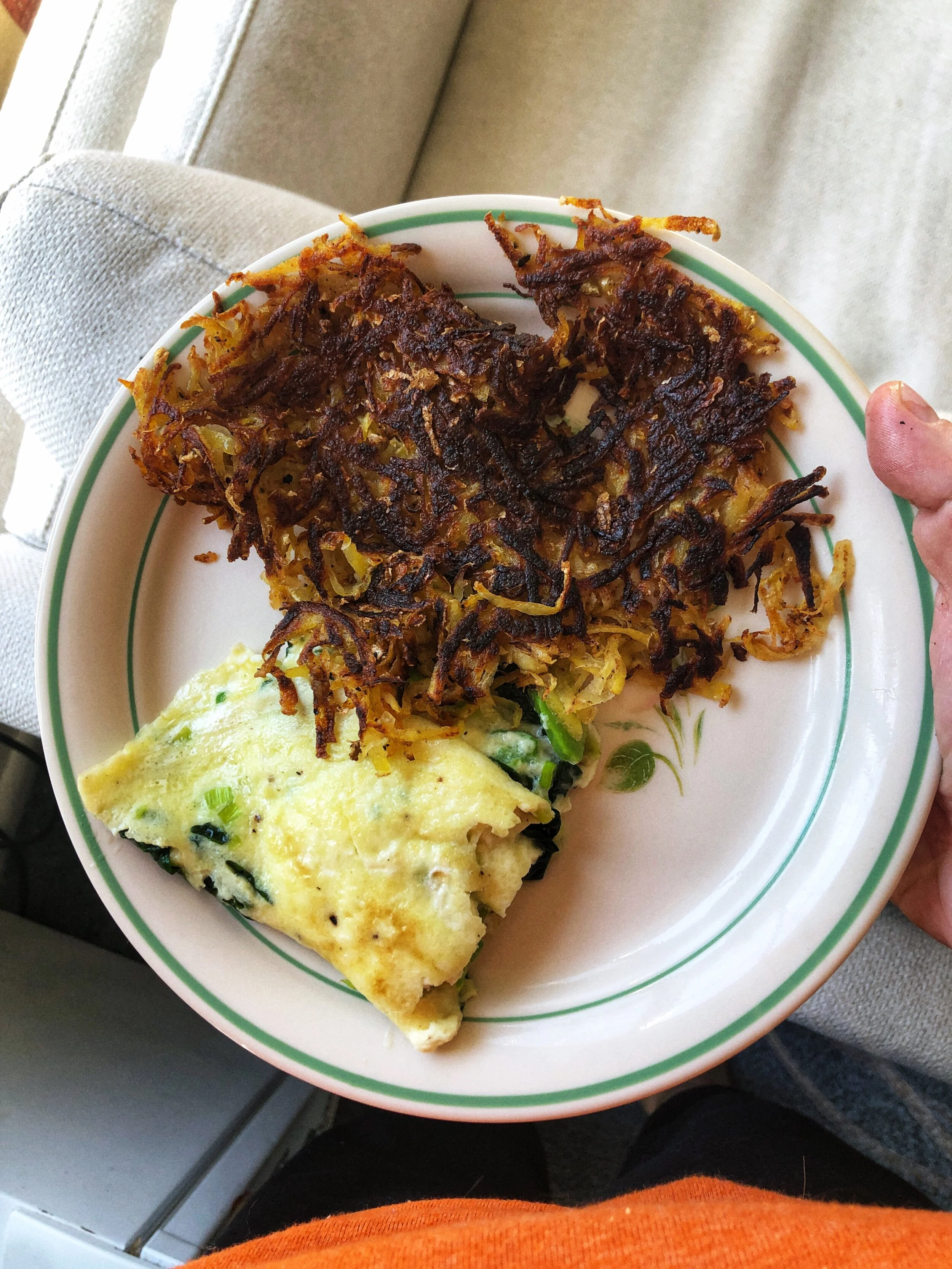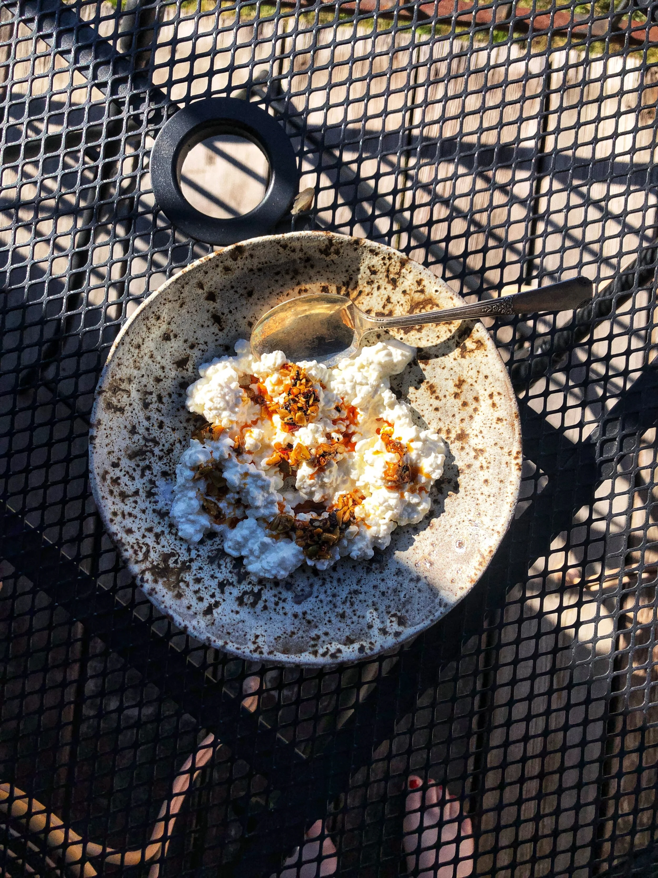 cottage cheese with crunch salsa macha ; shared French spinach omelette and hash browns ; toad in a hole / eggs on horseback