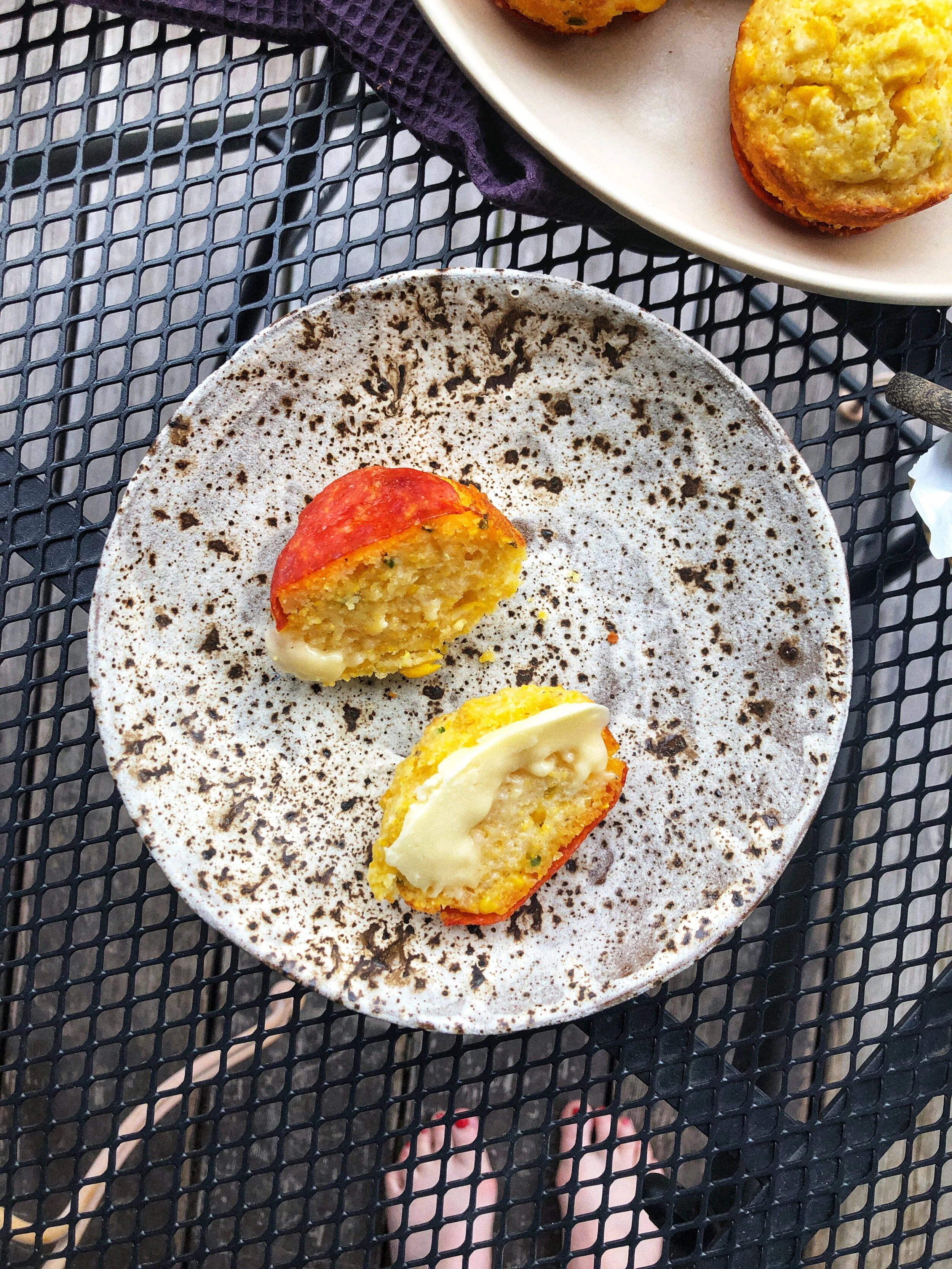 buttermilk cornbread muffins with pepperoni “liners” and French butter ; toasted for breakfast with butter and maple syrup