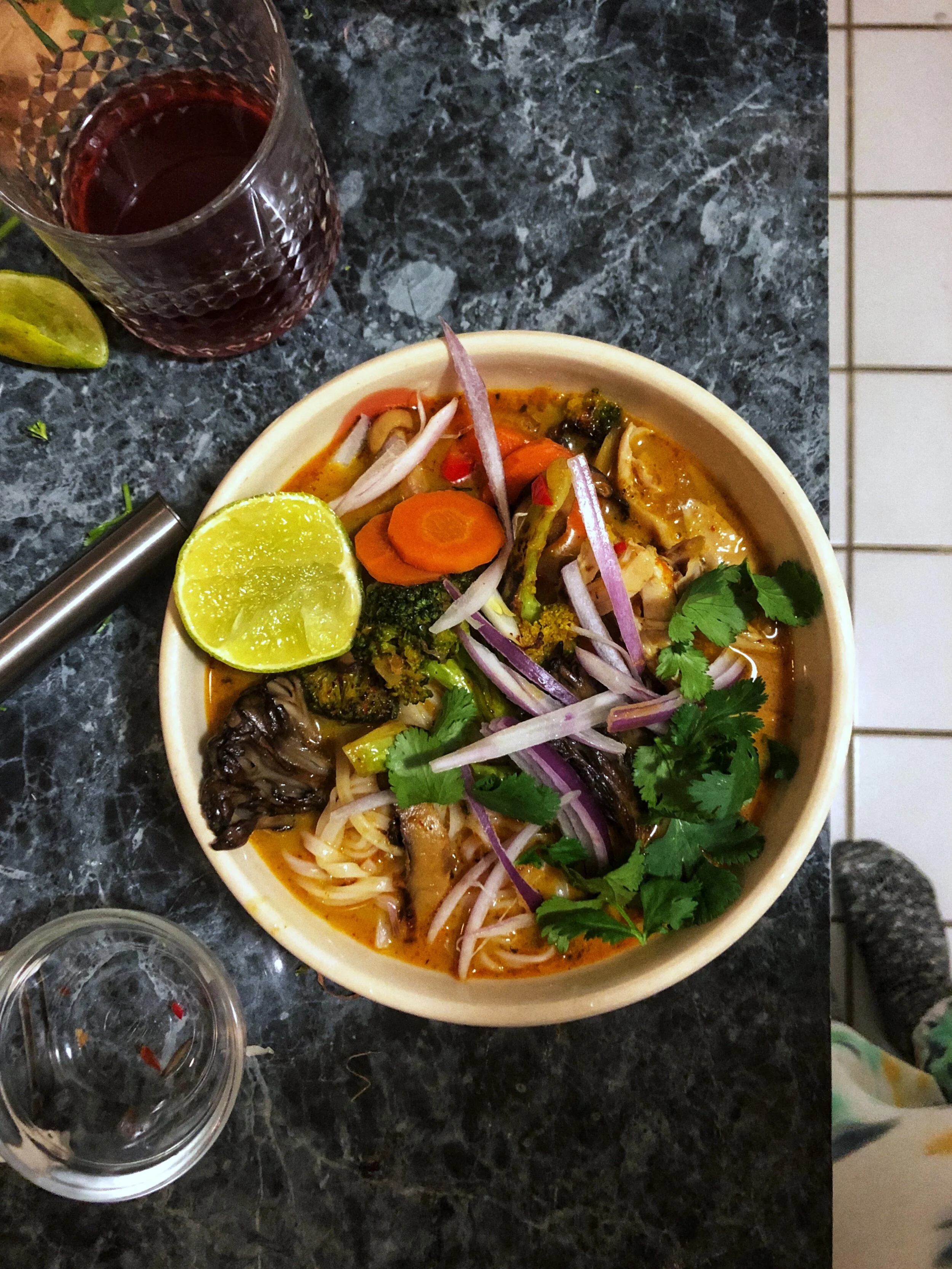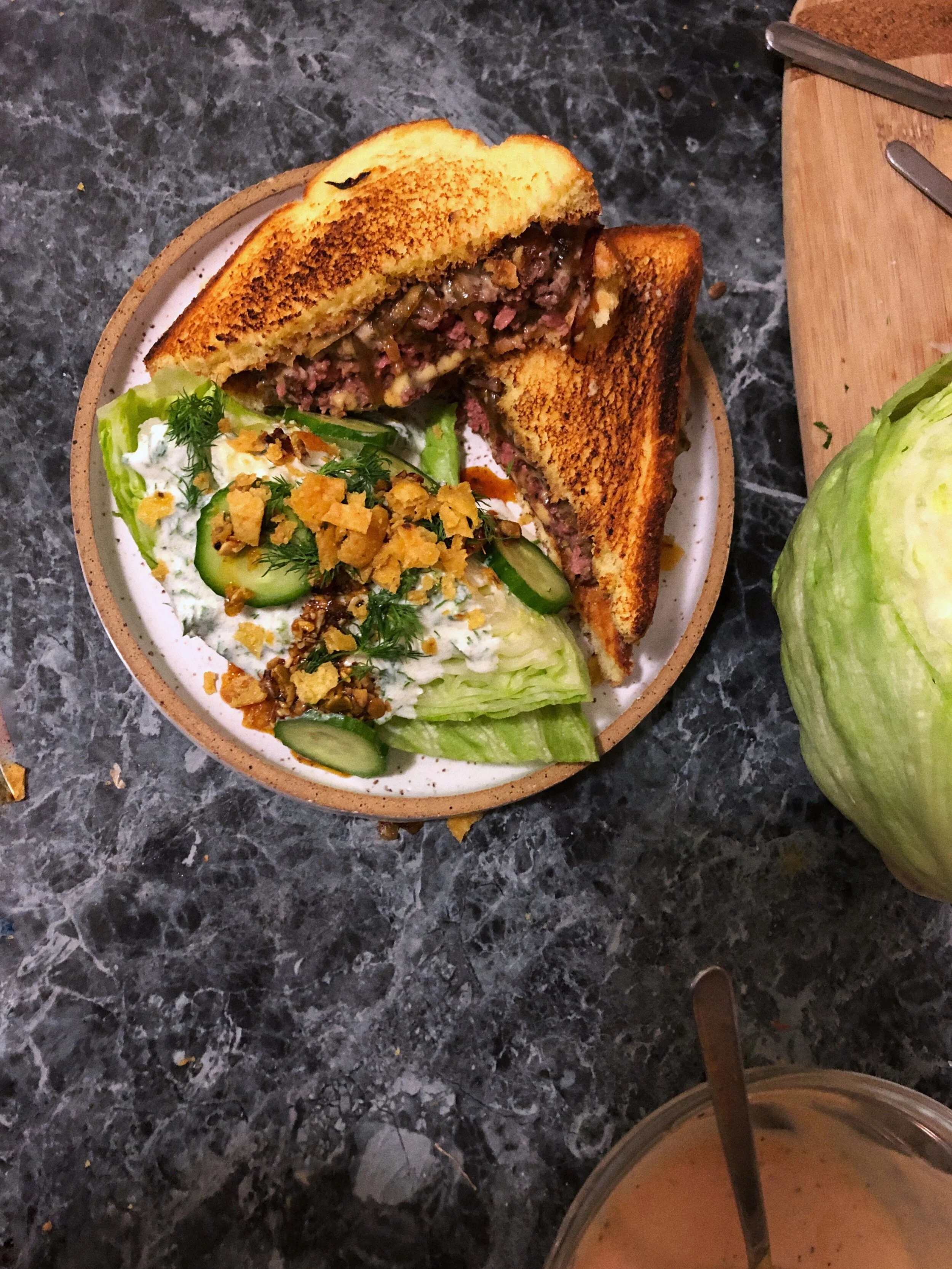 patty melts and Greek wedge salads with yogurt dressing ; khao soi curry soup with rice noodles ; anchovy gin martini